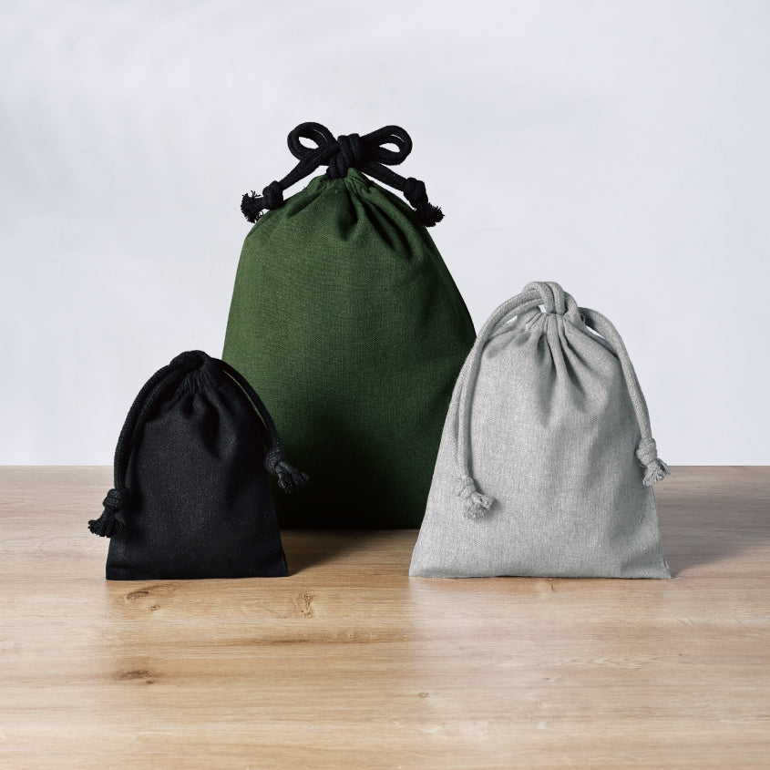 サステナブルな素材を使用したリサイクルコットン巾着バッグ。企業ロゴやオリジナルデザインをプリントして、販促品やギフトとして活用できます。シンプルながらも洗練されたデザインで、幅広い用途に対応。