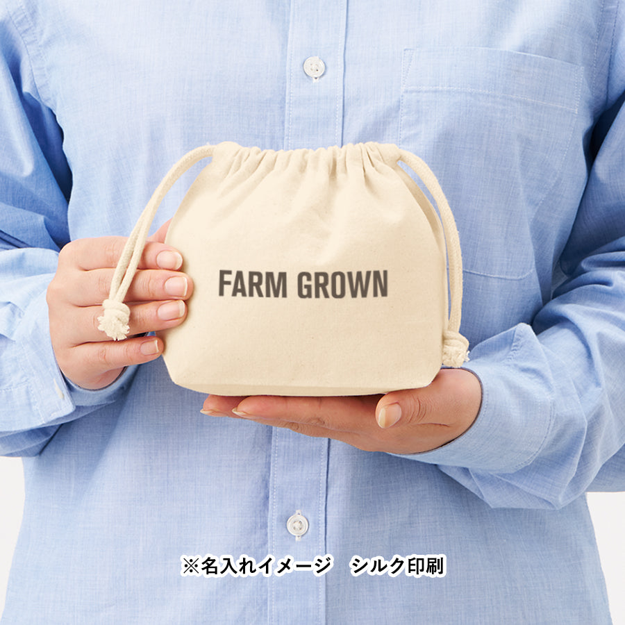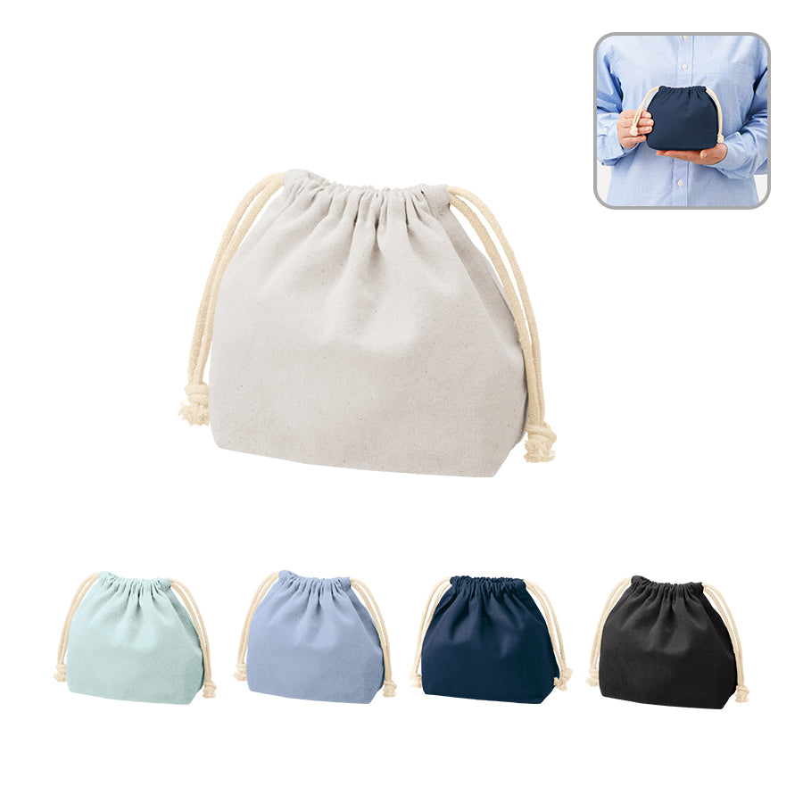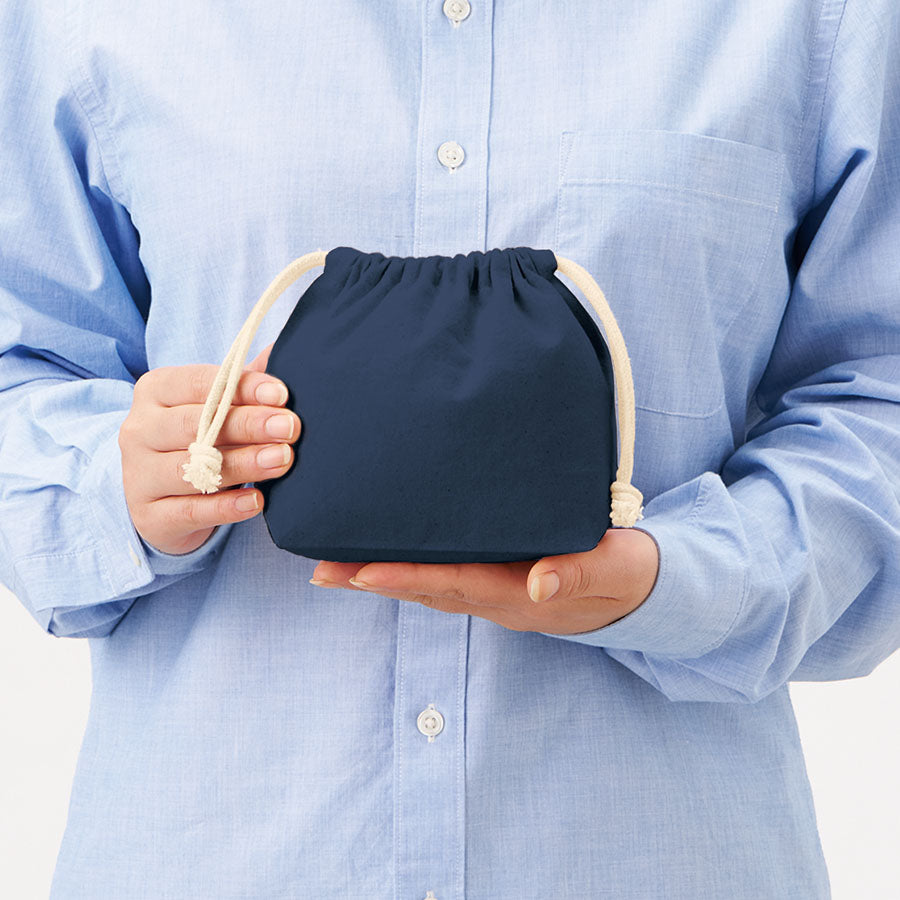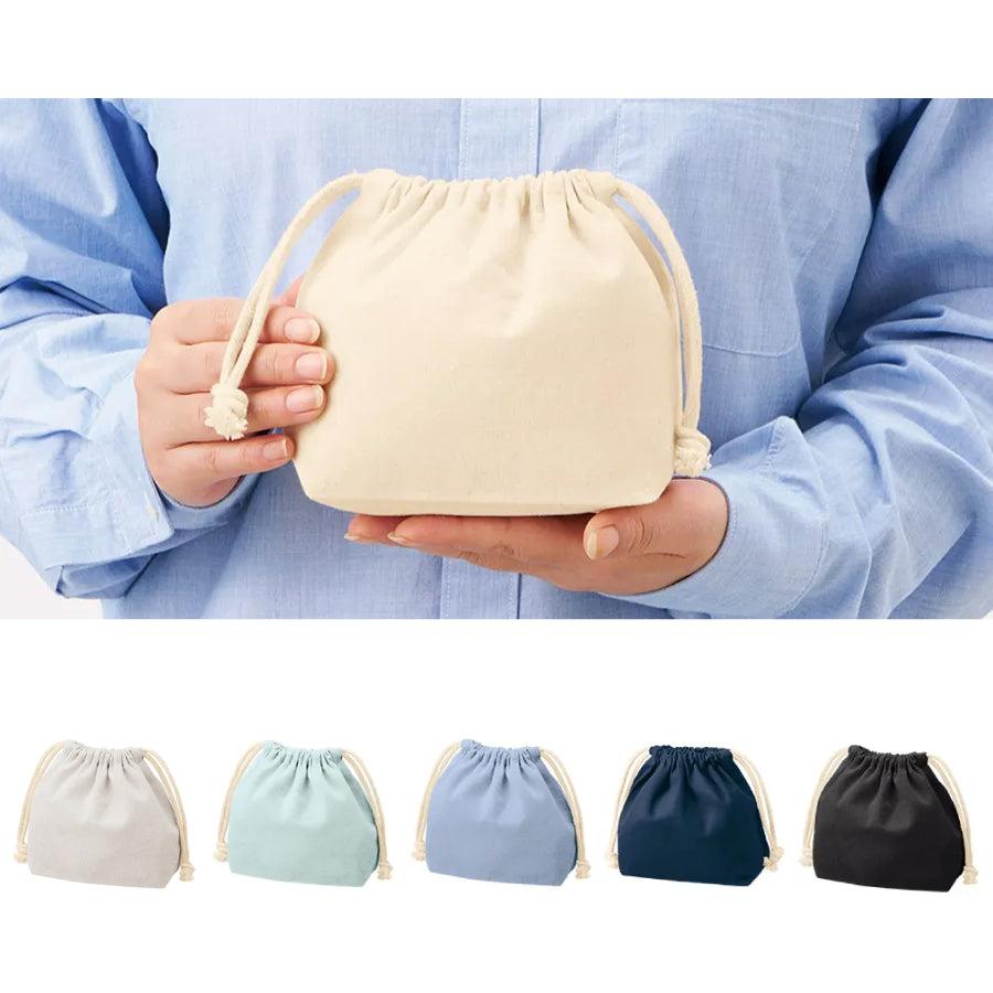 5オンスの厚手コットンを使用したマチ付き巾着ポーチに、オリジナルプリントを施して販売しています。 コロンとした可愛らしい形状と豊富なカラー展開で、コスメやギフトの包装に最適です。