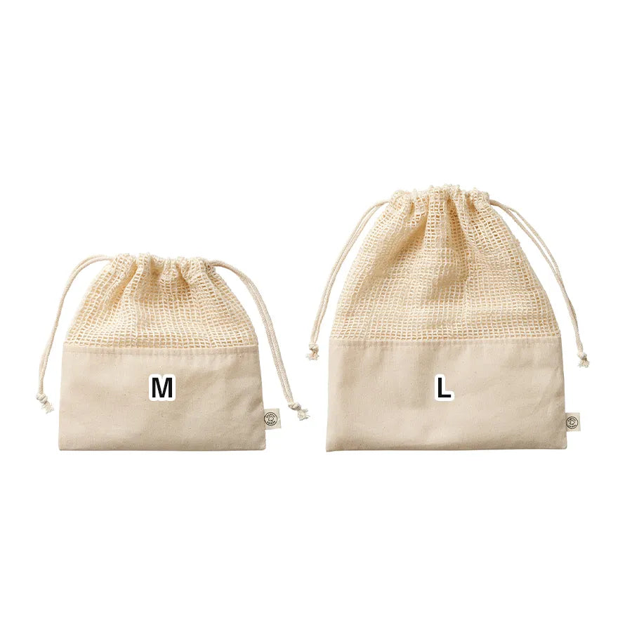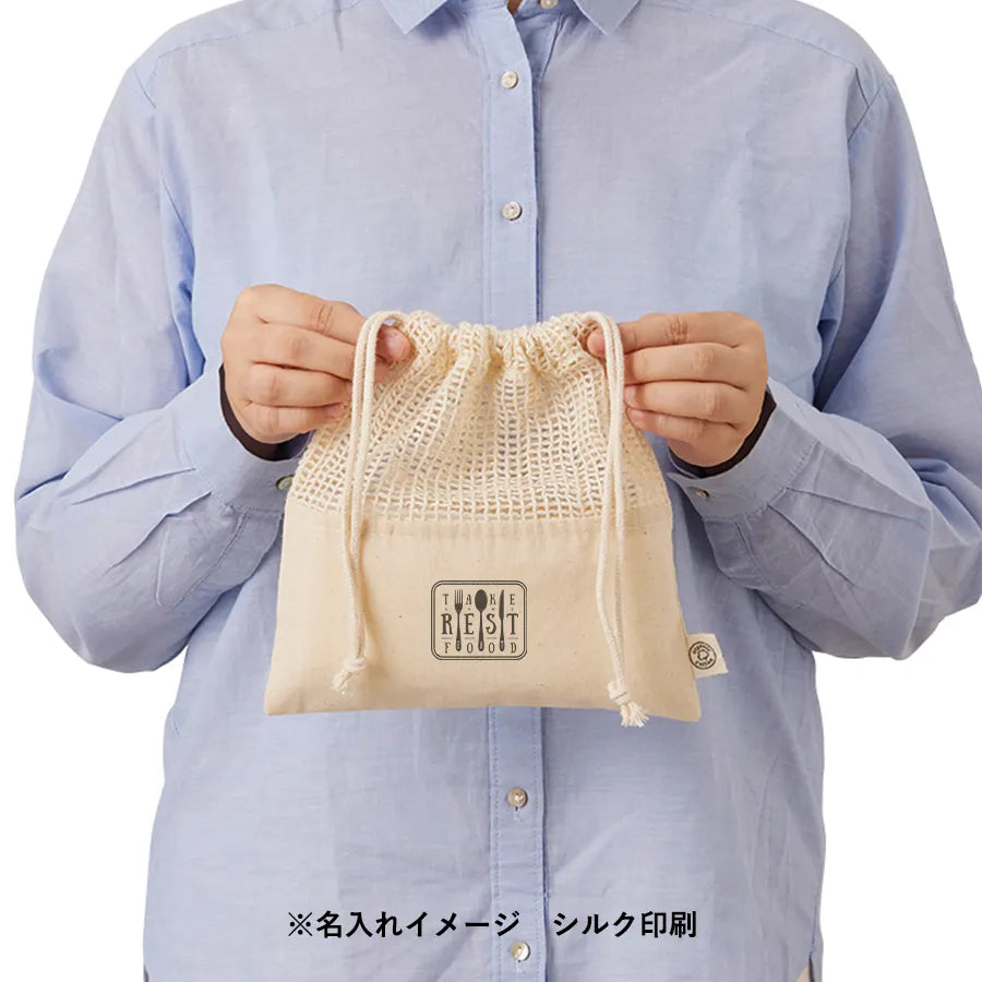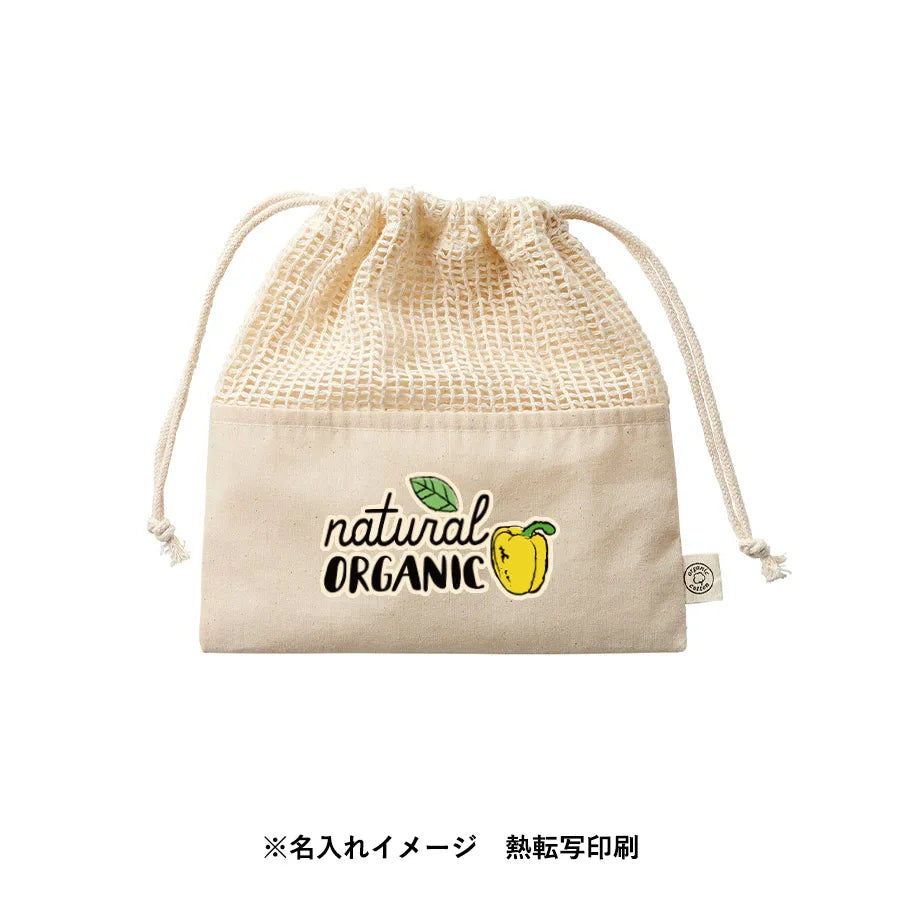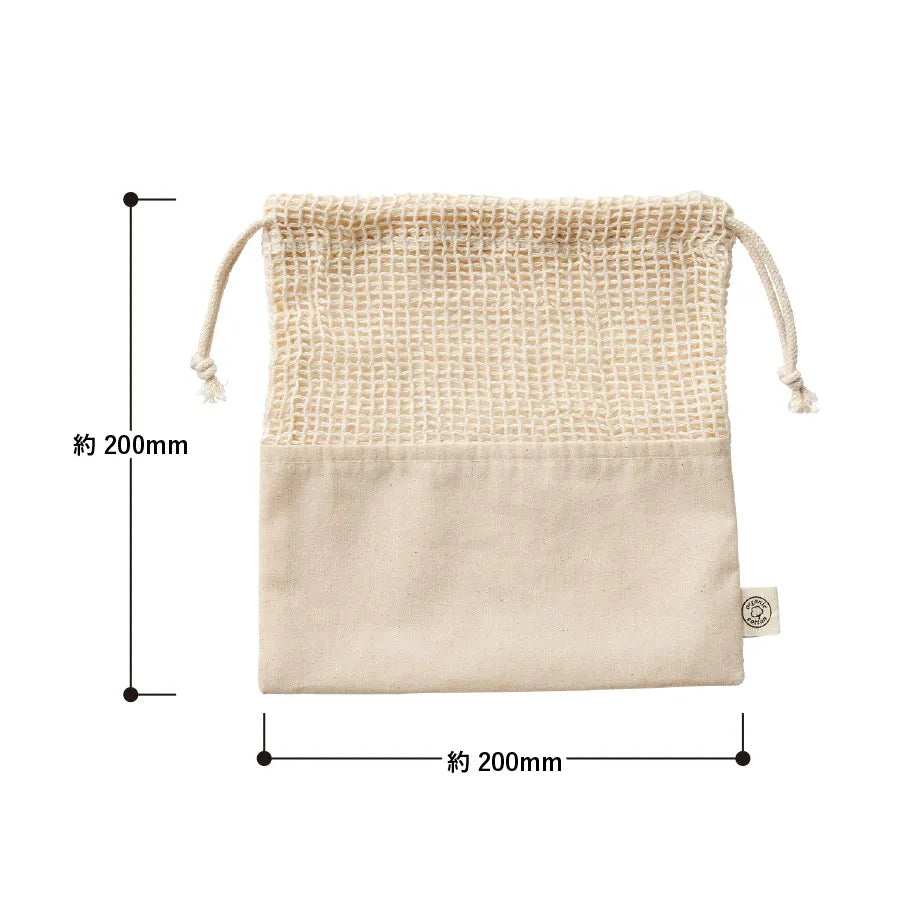 オーガニックコットンを使用した、ネット素材と布地を組み合わせた巾着袋にオリジナルプリントを施して販売しています。 中身が見える透明感のあるデザインは、ディスプレイ効果が高く、販促品やギフトパッケージに最適です。