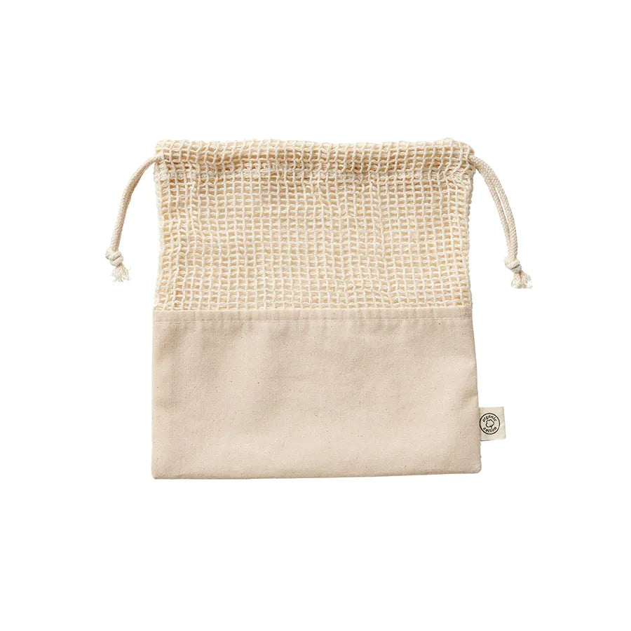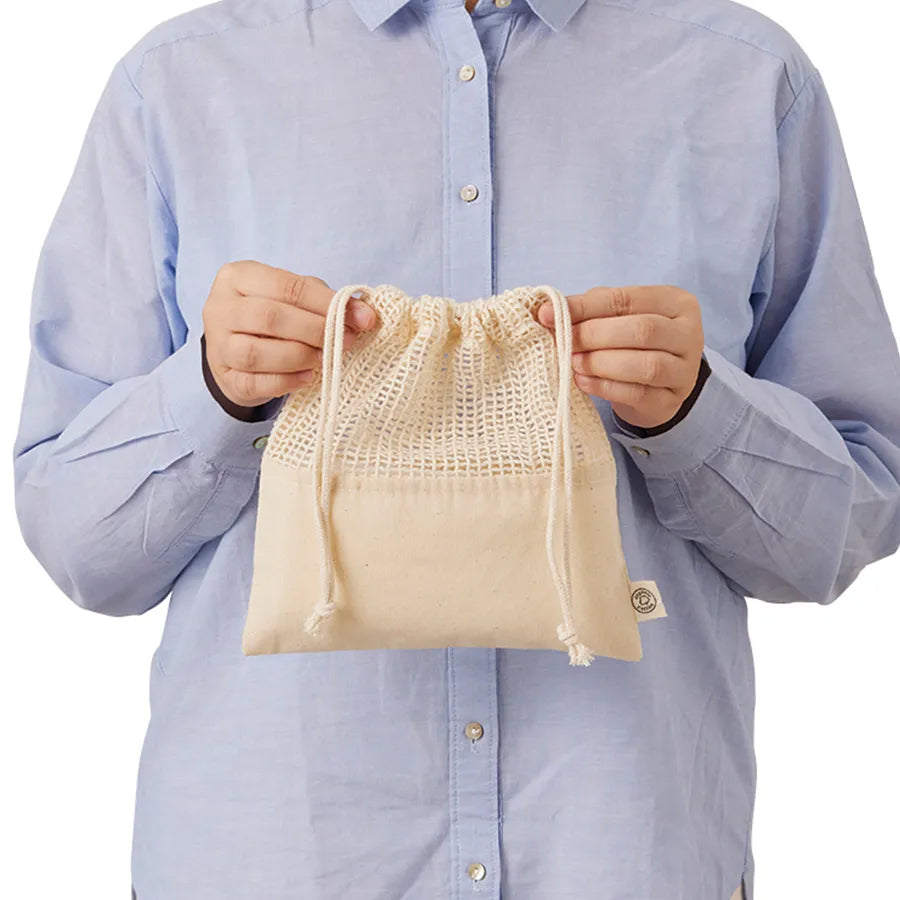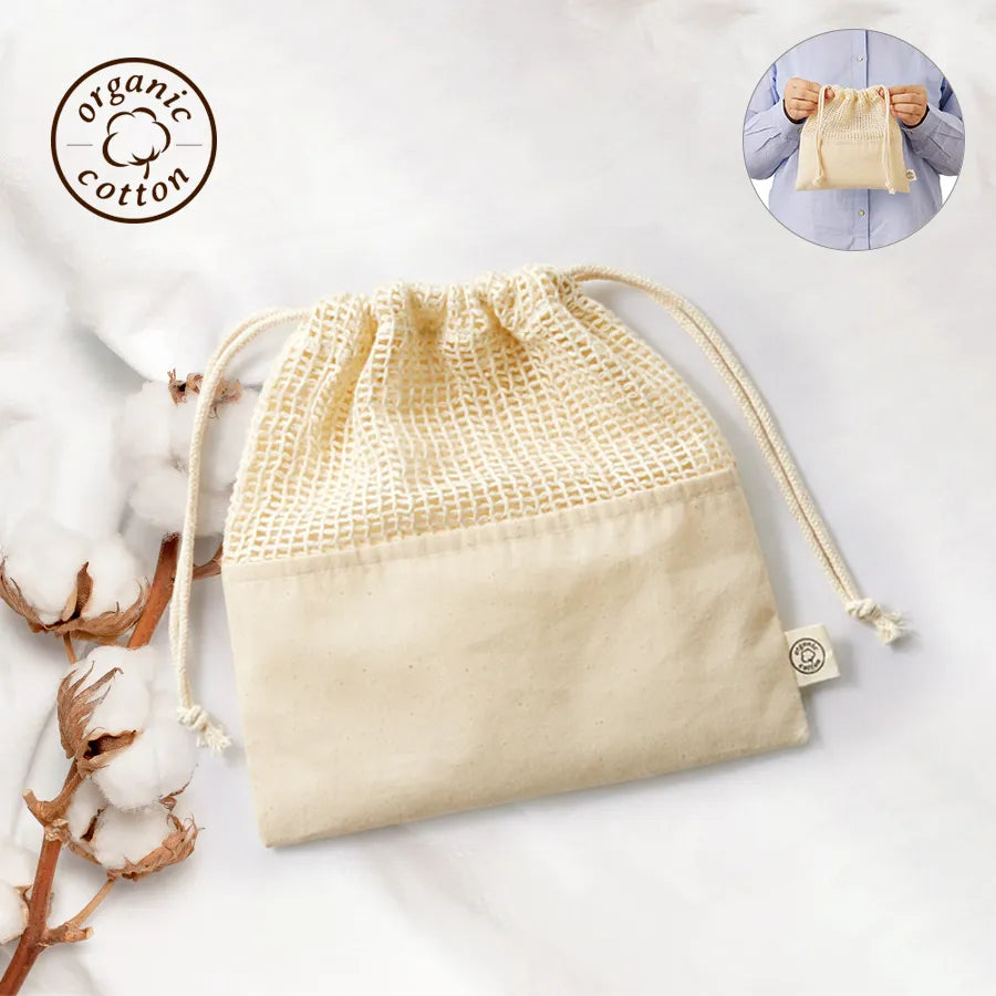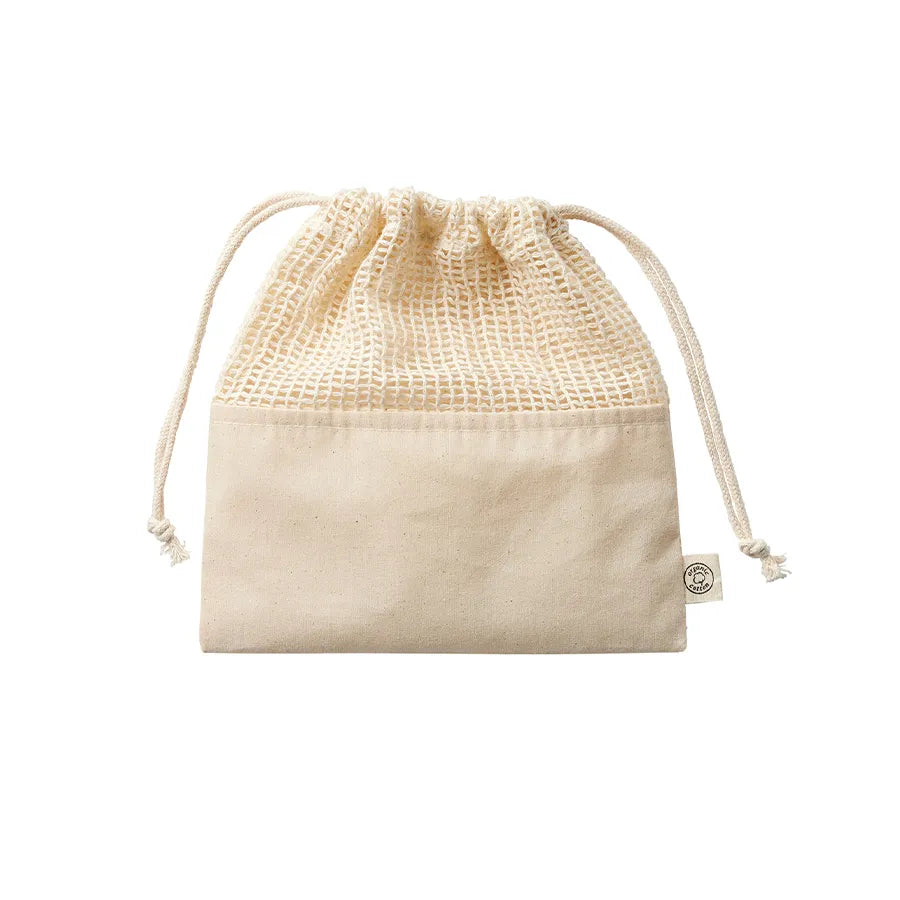 オーガニックコットンを使用した、ネット素材と布地を組み合わせた巾着袋にオリジナルプリントを施して販売しています。 中身が見える透明感のあるデザインは、ディスプレイ効果が高く、販促品やギフトパッケージに最適です。